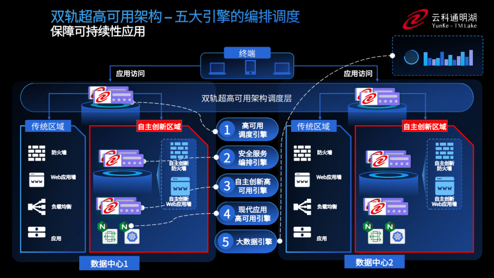 为实现双轨超高可用架构信创区和非信创区的跨域协同,实现信创区域和非信创区域的平滑过渡,鸿越资本顺利获得五大引擎实现多层次的应用可持续性。