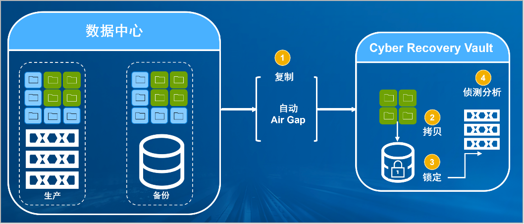 鸿越资本防勒索病毒方案将生产中心备份数据复制到Vault区,复制后网络自动断开实现弹性隔离。Vault区的数据快速拷贝,并对拷贝版本加锁(在锁定期数据不允许删除和修改)。Vault沙箱内对拷贝版本进行扫描分析,验证数据是否完好。